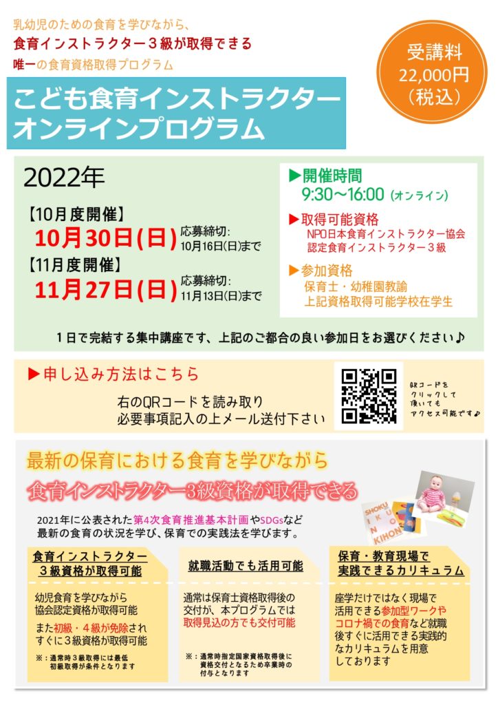 ※講義内容の例;食育とは&歴史、食育の三本柱、園給食の意義、離乳食・ミルクについて、食具の伝え方、マナーの伝え方、アレルギーの実践対応、園での食育実例 等